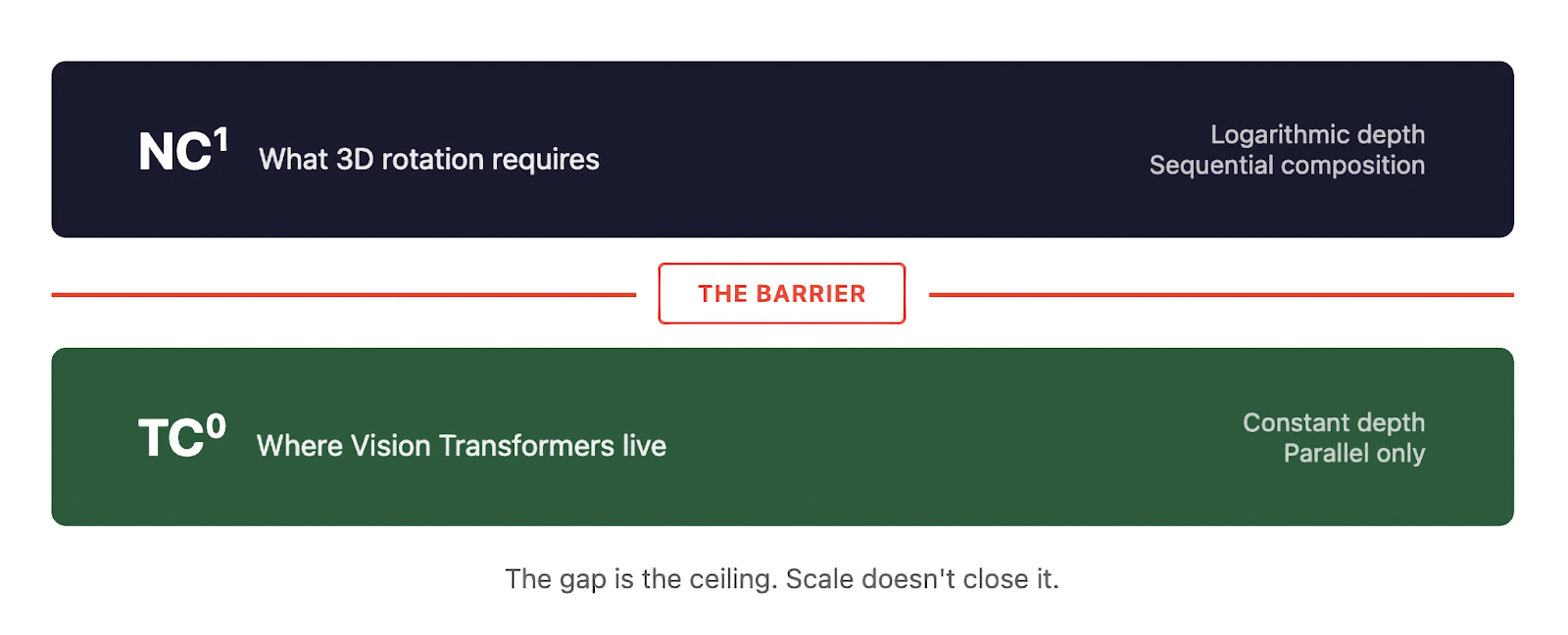 Here's the connection. Standard Vision Transformers, operating with fixed layers and polynomial precision, are bounded by TC⁰. Recent theoretical work has locked this down. Transformers excel at parallel pattern matching. They struggle with anything requiring sequential composition.